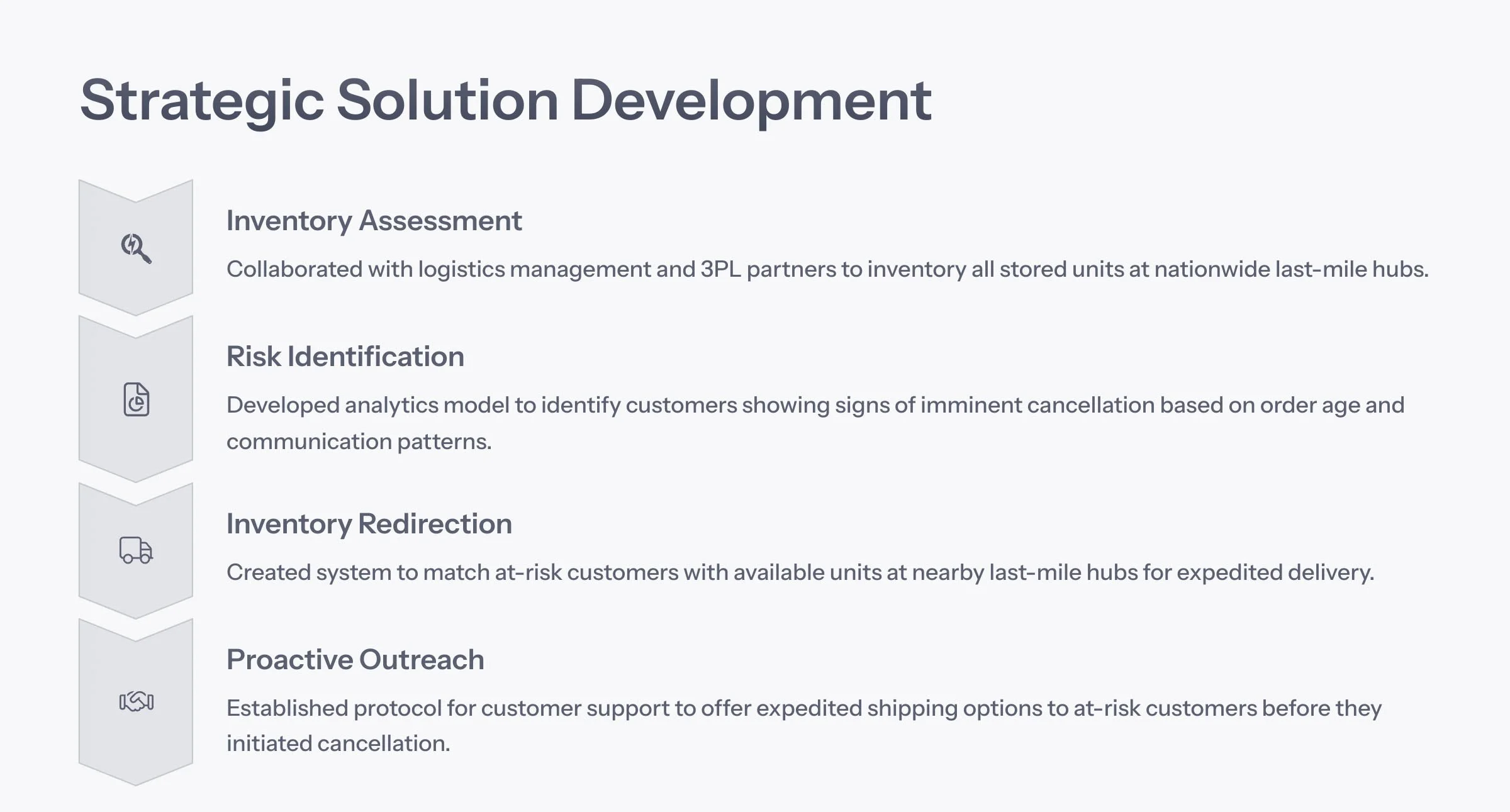 This program will span logistics, customer support, and data teams. We will focus on customers whose orders are delayed past the five-week mark—identified as the point of highest cancellation risk. The system will surface available inventory at nearby hubs and allow trained agents to offer expedited shipping if criteria are met. MVP will cover high-value orders with known inventory match. We will exclude broad logistics or shipping contract changes.